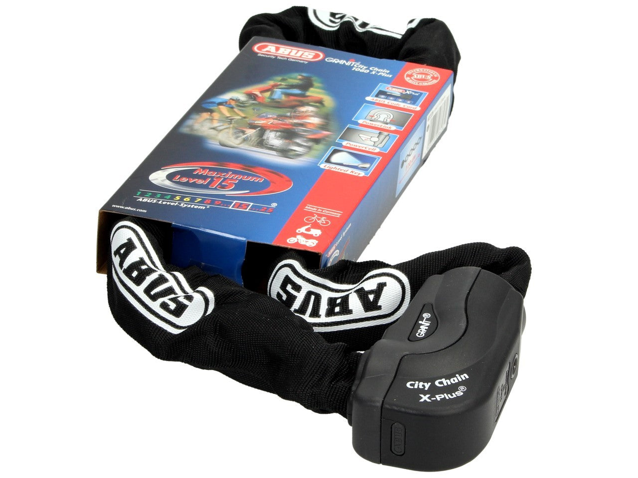 Patentierte ABUS-Kraftzellentechnologie mit direkter Verriegelung der Kette im Schlossgehäuse